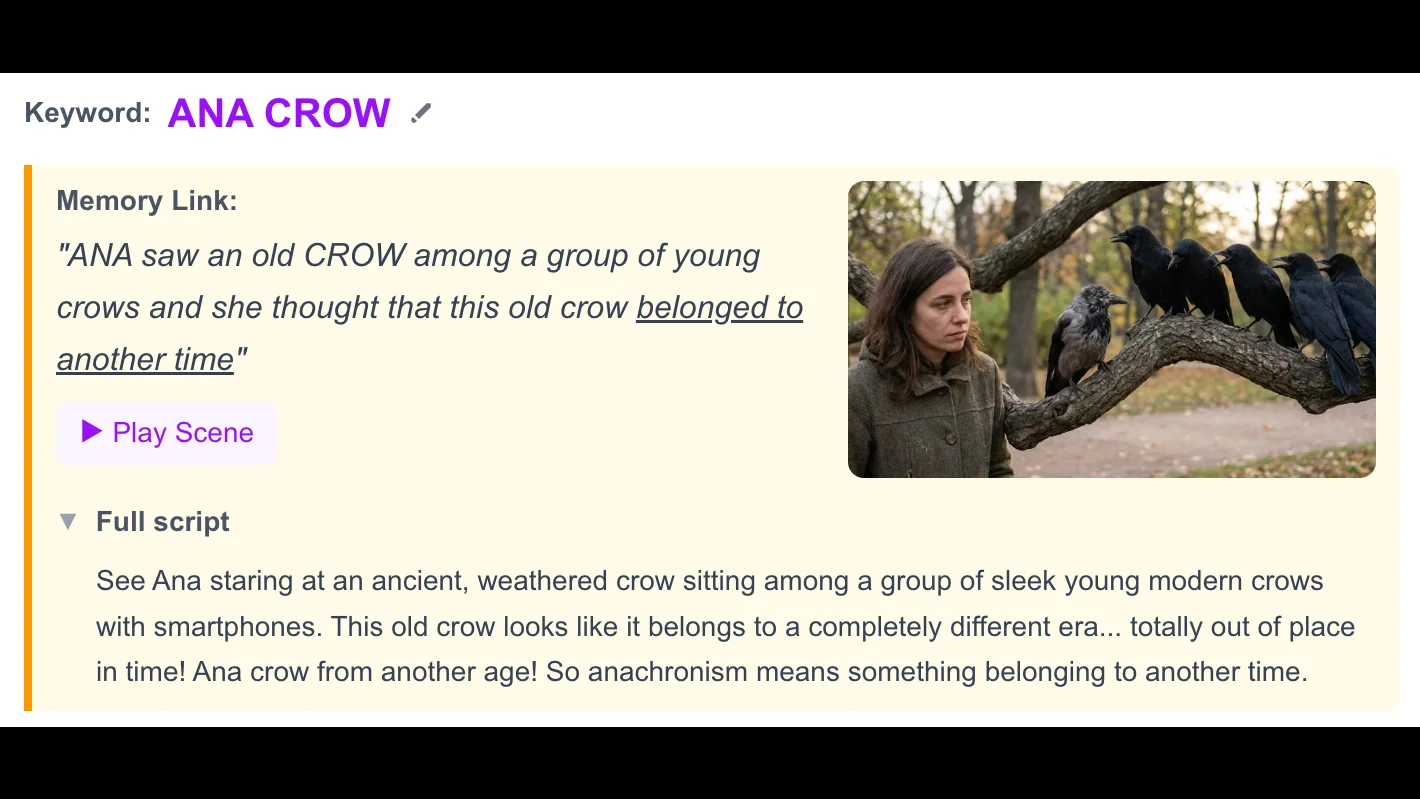 That's it. One exposure, and the meaning sticks. The keyword acts as a hook, and the vivid image makes it unforgettable.